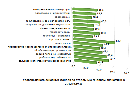 График. Уровень износа основных фондов по отдельным секторам экономики в 2012 году, %