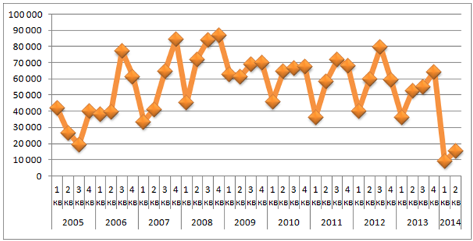 Schedule 1. Dynamics of foreign investments into all branches of the Russian economy by quarters in 2005 — the 2nd quarter of 2014, million rubles.