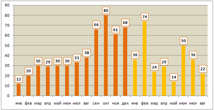Schedule. Dynamics of venture transactions number by months in January, 2013—August, 2014