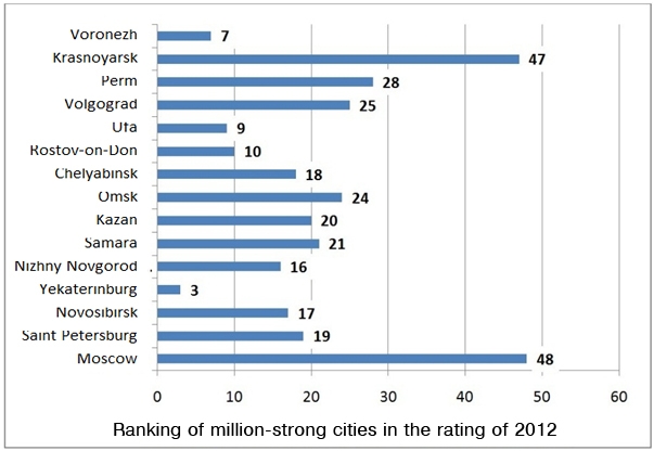 Picture 1. Ranking of million-strong cities in the rating of 2012 (the cities are sorted by the population number)